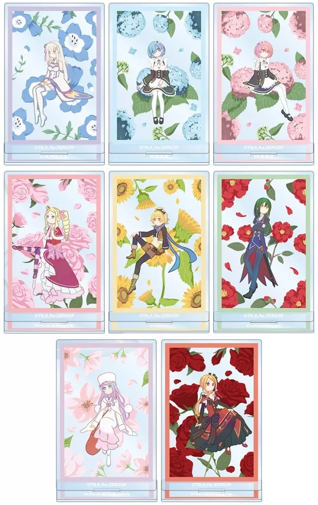 With illustrations of Emilia, Rem, Lamb, Beatrice, Felt, Kursch, Anasta Shea, and Priscilla incorporated into a botanical design, it is newly drawn with a delicate touch and finished into an acrylic stand.