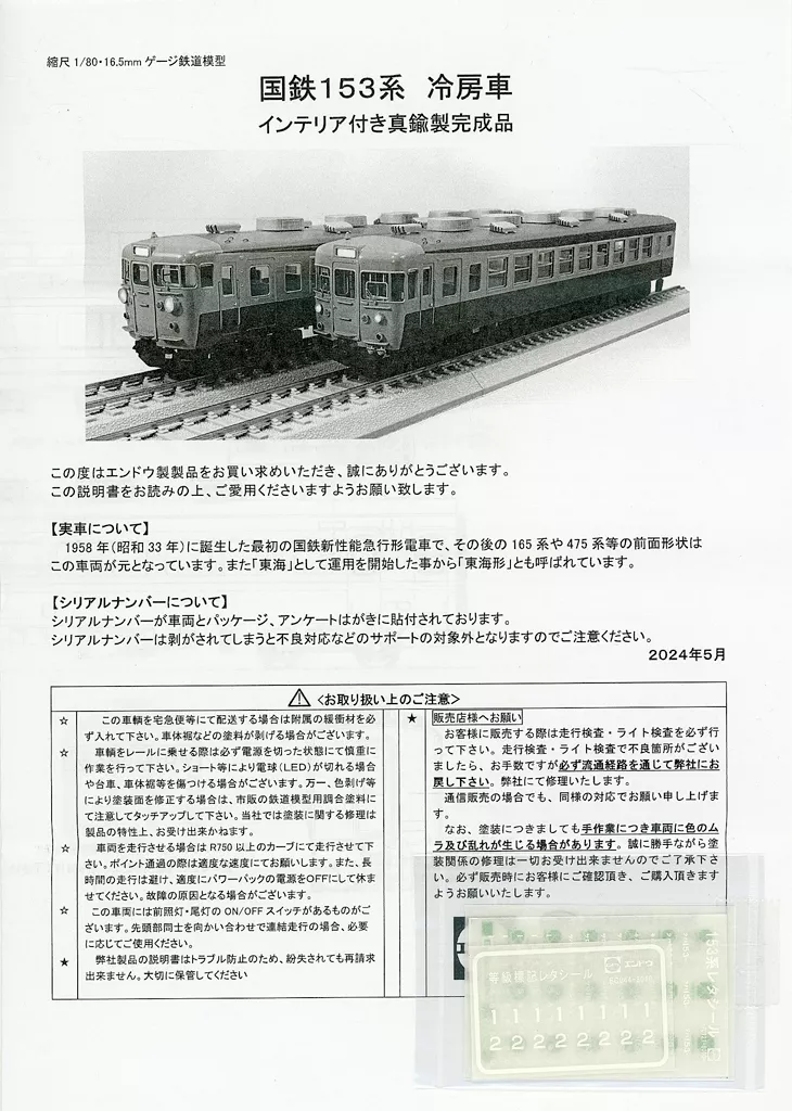 Product Explanation The Series 153 was the first JNR new-performance express train born in 1958 (1958), and the front shapes of the Series 165 and Series 475 were based on this train.