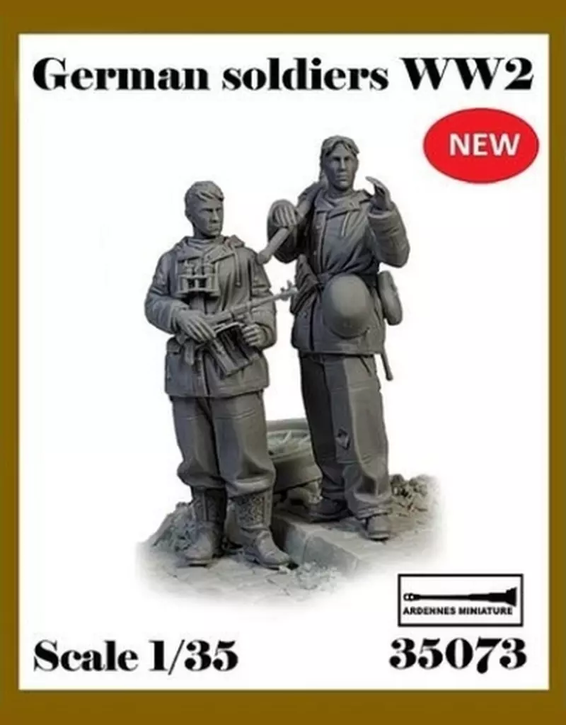 [AR35071] 1/35 WWII German MP40 equipped for winter and [AR35072] 1/35 WWII German panzer Faust equipped for winter. Each item is a set with a soldier equipped for winter who has a WWII German MP40 and a soldier equipped for winter who has a WWII German panzer Faust details]