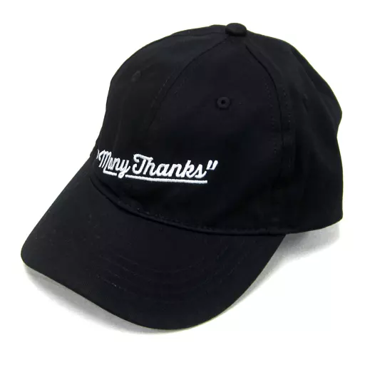 A cap with an embroidered" Many Thanks "logo.