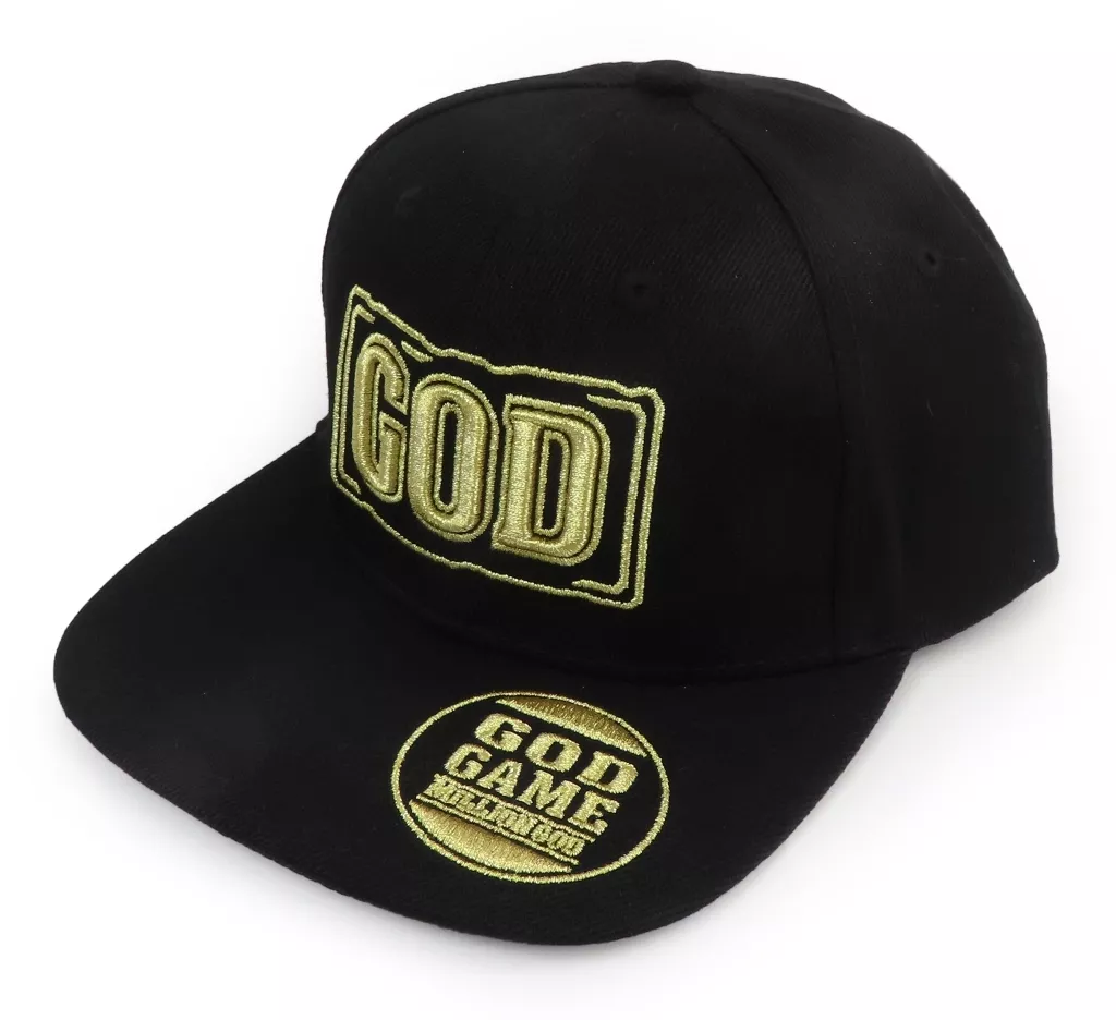 The word "GOD" embroidered in gold is sure to stand out among the many UNI-MARKET products!
