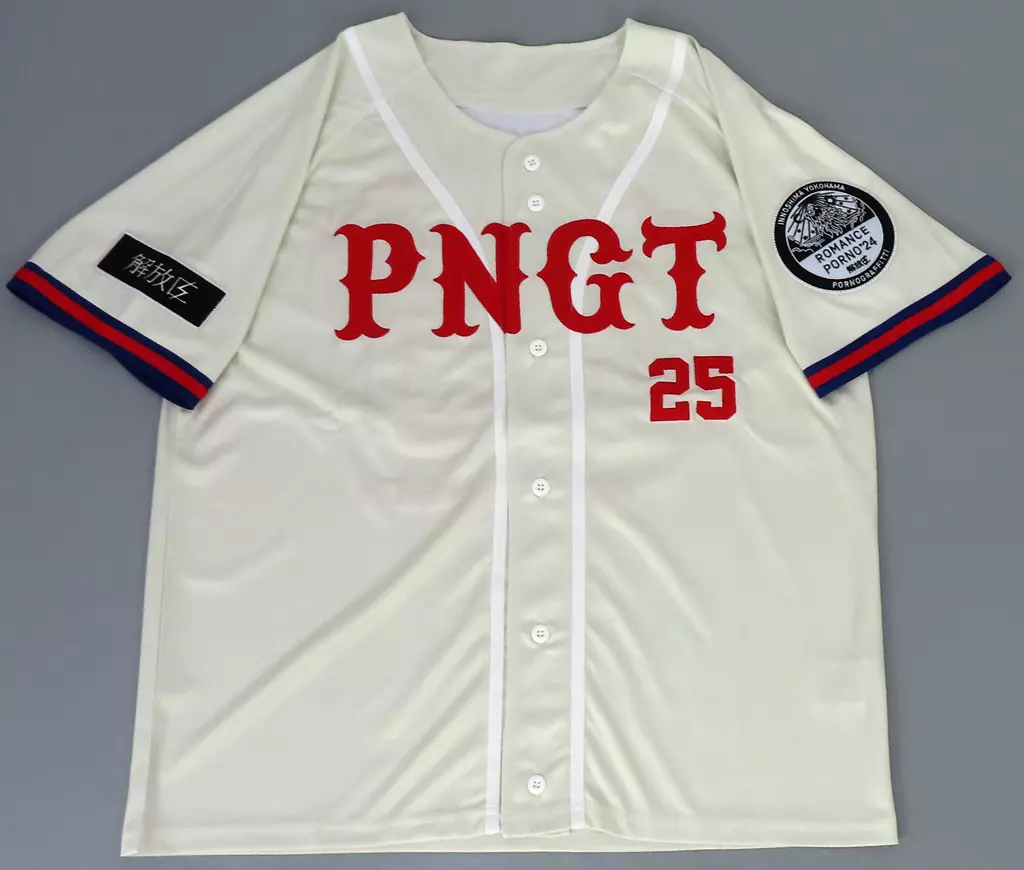 It is designed with the words "PNGT" and "25" embroidered on the chest and "ROMANCE PORNO' 24", "25" and "PORNOGRAFFITTI" embroidered on the back.