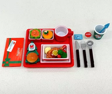 menu, knife, fork, spoon, cup, tray, Santa cup,