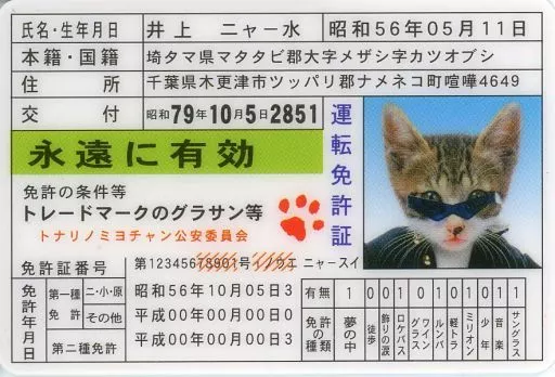 Japanese title: 食玩 雑貨 井上 ニャー水 「なめねこミニ免許証シリーズ」