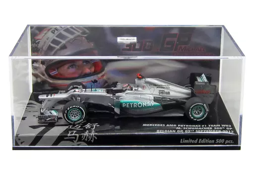 Product Description ■ MERCEDES AMG PETRONAS F1 TEAM W03 M. SCHUMACHER 300th GP BELGIAN GP 2nd SEPTEMBER 2012 (silver x green) is now available in a 1/43 scale display model.