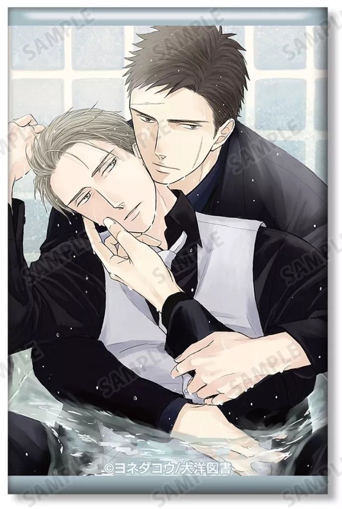 The illustration of Yashiro and Domeki is made into a square metal badge.