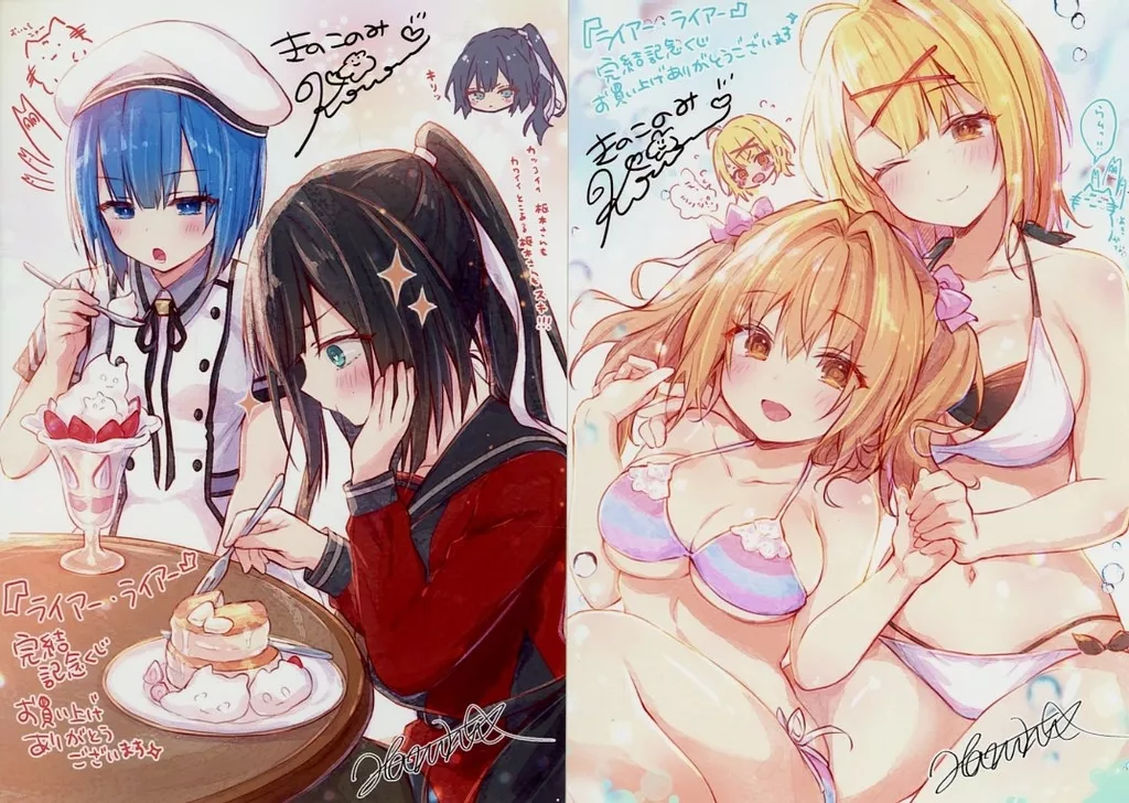 Product explanation ■ A set of two bromides with precious rough illustrations of 『 Liar and Liar 』. Author : Haruki Hisazoe's duplicate signature and Mr. konomi's duplicate signature and comment!
