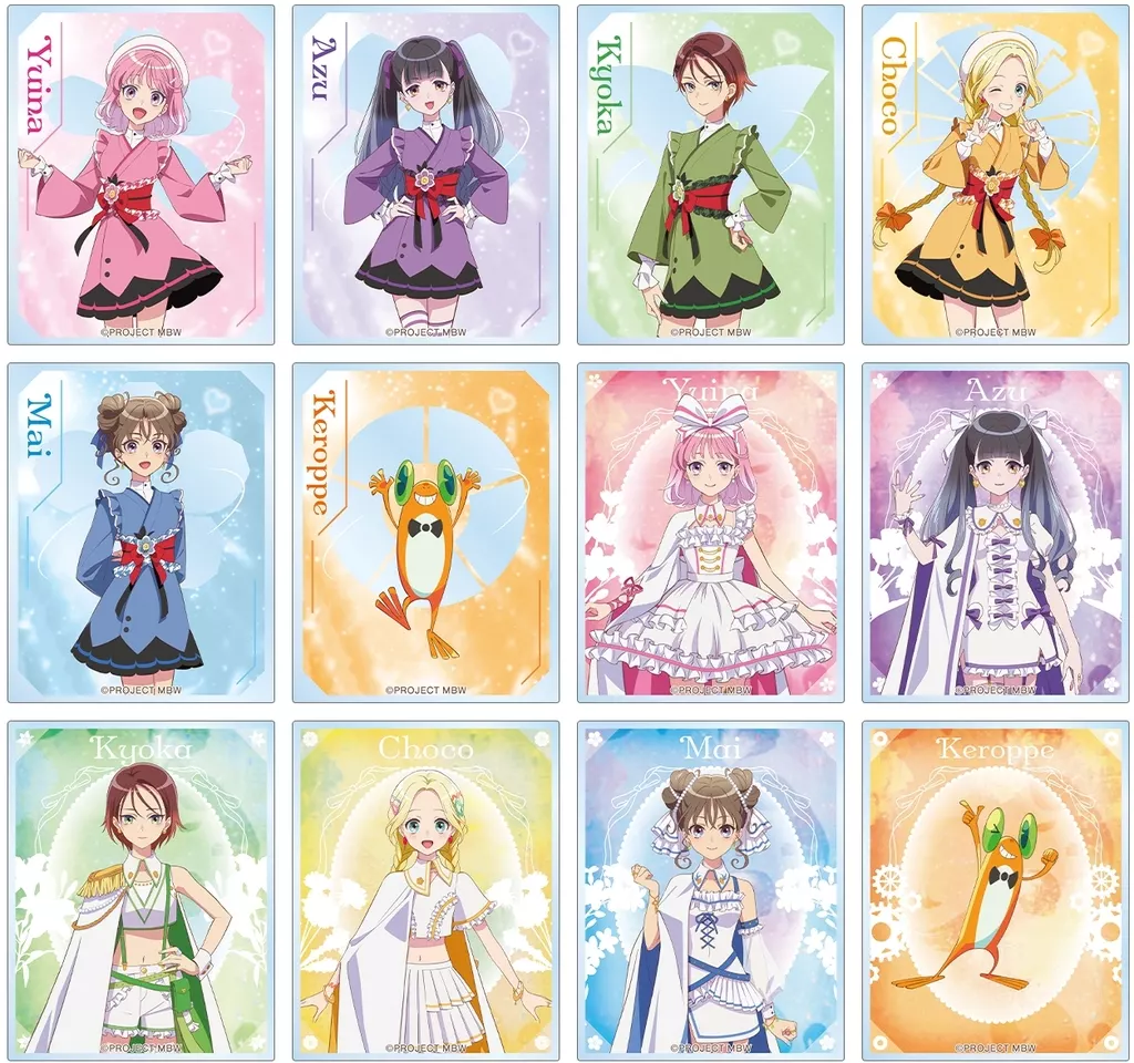 Acrylic card with illustrations of Akagi Yuina, Niisato As, Kitahara Kyoka, Mitsumata Chocolate, Kamiizumi My, and ケロッペ.