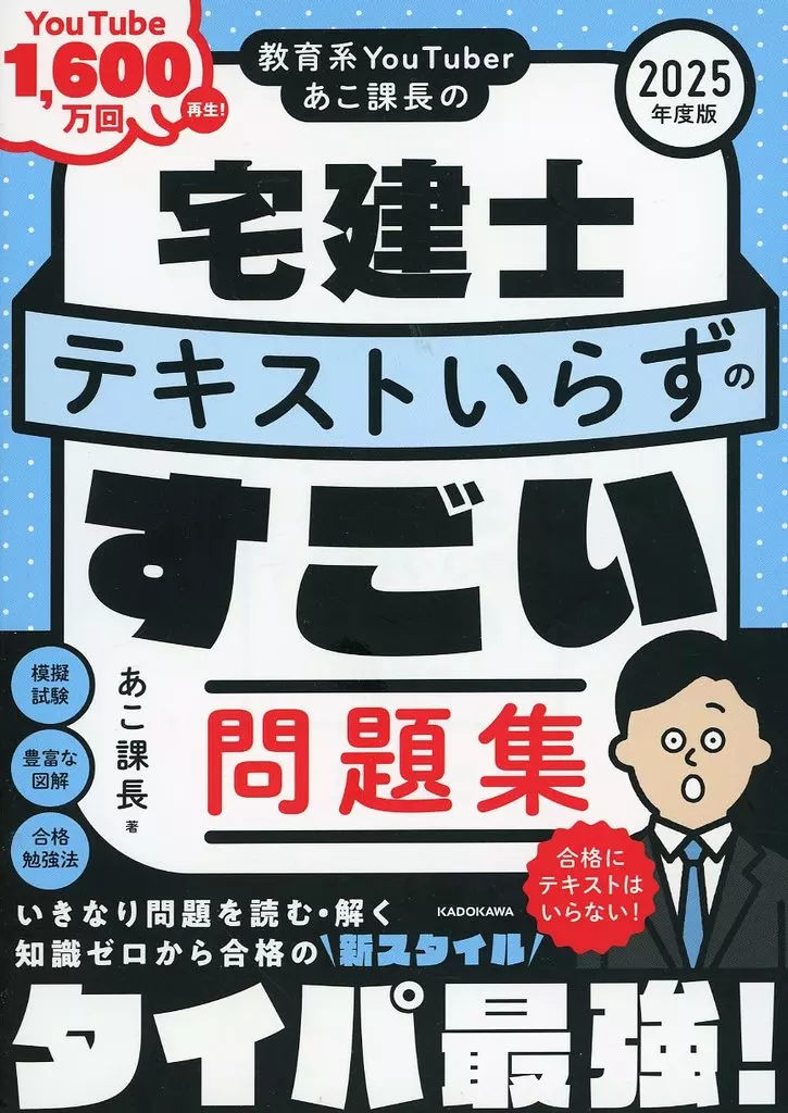 ★ Get the shortest pass without text! ★ This book is a great work book with "New Style & Taipa Strongest" that can be studied super efficiently without text. ・ It is hard to read thick text and solve thick work book. ・ By the time you finish reading the text and solve work book, you forget what you learned. ・ Even if you read the text, you don't understand what you learned. ・ Even if you read the text, you don't understand what you learned. ・ I want you to pass it in the shortest time! ・ I have to study because I have to work. ・ I want you to use it and pass it! "The lecturer is" Ako Kacho ", who is popular on YouTube for the registered real estate agent Examination. Based on the lecture content of YouTube 14,000,000 reviews that have led many participants to pass, it explains in an easy-to-understand way what is necessary for passing it. There are plenty of diagrams and visual learning. Beginners and self-learners can enjoy and steadily learn passing level knowledge based on the content of lectures that have led many participants to pass it. 3 STEPS for passing" Examples "," Solutions ", and" Solutions & Explanations ". First of all," Look at the examples "! You don't have to solve it! By knowing" what problems come out "first, you deepen your understanding of" Solutions ". [2]" Solutions "which is read" Solutions "explains the knowledge necessary to solve the examples, such as important terms and points that are easy to make mistakes. You can learn" Examples "! You don't have to solve it! By knowing" what problems come out "first, you deepen your understanding of" Solutions ". [2]" Solutions "which is read" Solutions "explains the knowledge necessary to solve the examples, such as important terms and points that are easy to make mistakes. You can learn" What knowledge is necessary to solve "and" how to solve "! Thus, passing knowledge is firmly established! [3] All-in-one with a prediction simulation test at the end of the book! This one book is perfect!