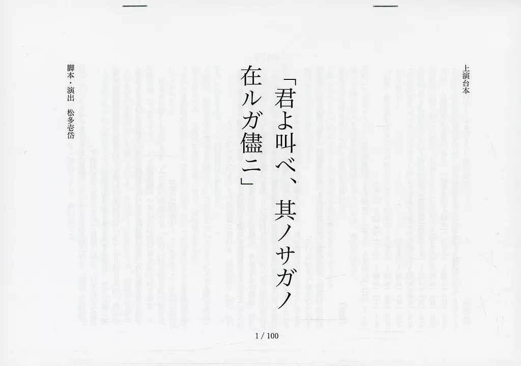This item is the performance script of "Kimi o Scream, ノサガノ is Ruganatini" which was performed at Sun Mall Studio from March 24 to April 1, 2018.