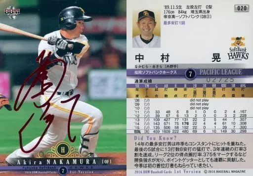 BBM / Regular Card / Fukuoka Soft Bank Hawks / BBM2016 Baseball Card 1 st Version 020 [Regular Card] : Akira Nakamura (Red hot stamping with signature) (/ 25)
