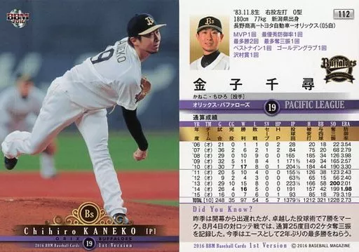 BBM / Regular Card / Orix Buffaloes / BBM2016 Baseball Card 1 st Version 112 [Regular Card] : Chihiro Kaneko