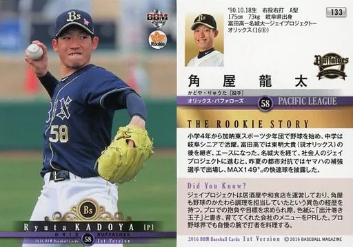 Japanese title: BBM/レギュラーカード/オリックス・バファローズ/BBM2016 ベースボールカード 1stバージョン 133[レギュラーカード]:角屋龍太