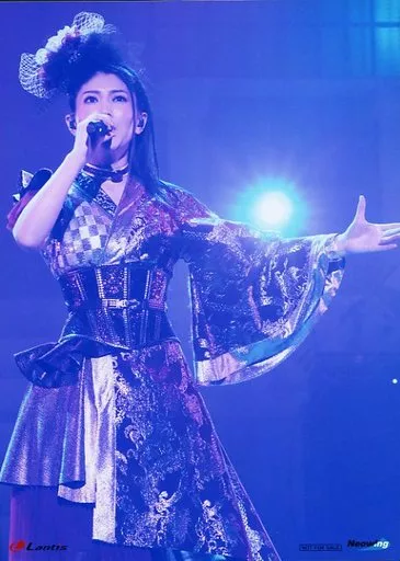 Japanese title: 生写真(女性)/声優 茅原実里/ライブフォト・膝上・衣装金・右手マイク・左手パー・背景青・2Lサイズポートレート/DVD・BD「Minori Chihara 10th Anniversary Live ~SANCTUARY~」ネオウイング特典ブロマイド