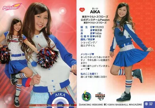 Japanese title: BBM/レギュラーカード/東京ヤクルトスワローズ公式ダンスチーム Passion/BBM2016 プロ野球チアリーダーカード DANCING HEROINE -華- 華57[レギュラーカード]:AIKA