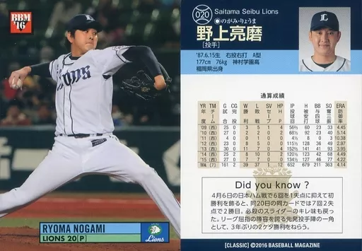 BBM / Regular Card / Active / Saitama Seibu Lions / BBM2016 Baseball Card Classic 020 [Regular Card] : Ryoma Nogami