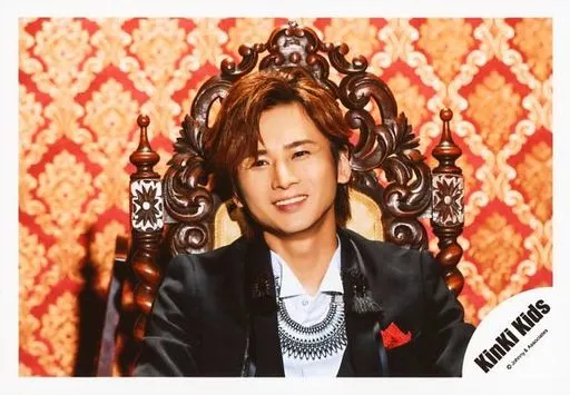 Japanese title: 生写真(ジャニーズ)/アイドル/KinKi Kids KinKi Kids/堂本光一/横型・バストアップ・衣装黒・白・顔傾げ・歯見せ・笑顔・椅子・背景赤ベージュ/『薔薇と太陽』PV撮影/公式生写真