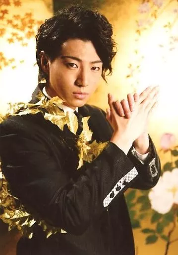 Japanese title: 生写真(男性)/俳優 矢崎広/上半身・衣装黒・白・両手重ね・右向き・植物・背景金/舞台「歳末明治座る・フェア」ブロマイド