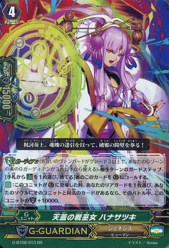 Japanese title: ヴァンガード/RR/Gユニット/ジェネシス/ヴァンガードG ブースターパック 第8弾「超極審判」 G-BT08/013[RR]:天蓋の戦巫女 ハナサツキ
