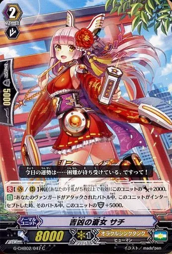 Japanese title: ヴァンガード/C/ノーマルユニット/オラクルシンクタンク/ヴァンガードG キャラクターブースター 第2弾「俺達!!トリニティドラゴン」 G-CHB02/047[C]:吉凶の斎女 サチ