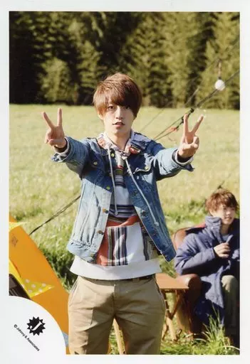 Japanese title: 生写真(ジャニーズ)/アイドル/Travis Japan Travis Japan/森田美勇人/膝上・衣装白青・デニム・両手ピース・屋外/公式生写真