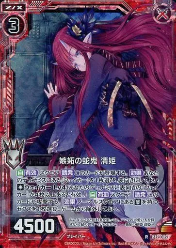 Japanese title: ゼクス/R/ゼクス/赤/第19弾『真神降臨編 覇神を穿つ者』 B19-002[R]:嫉妬の蛇鬼 清姫(ホログラムレア)