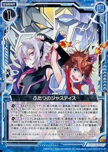 Japanese title: ゼクス/UC/イベント/青/第19弾『真神降臨編 覇神を穿つ者』 B19-040[UC]:ふたつのジャスティス