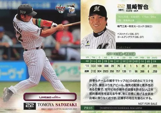 Japanese title: BBM/プロモーションカード/千葉ロッテマリーンズ/BBM2012 千葉ロッテマリーンズ 球場・書店 リミテッドエディション PR03[プロモーションカード]:里崎智也