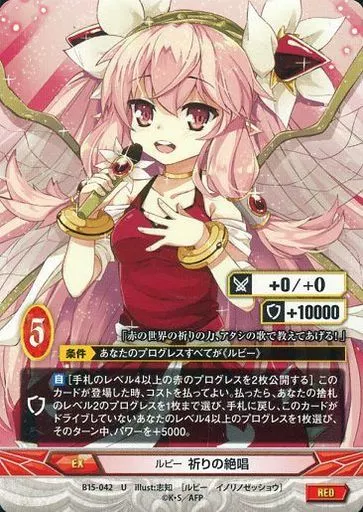 Japanese title: アンジュ・ヴィエルジュ/U/赤/EX/-/ブースターパック「四天に舞う乙女たち」 B15-042[U]:ルビー 祈りの絶唱