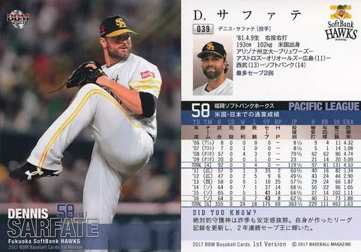Japanese title: BBM/レギュラーカード/福岡ソフトバンクホークス/BBM2017 ベースボールカード 1stバージョン 039[レギュラーカード]:D.サファテ