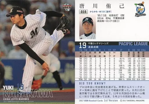 BBM / Regular Card / Chiba Lotte Marines / BBM2017 Baseball Card 1 st Version 059 [Regular Card] : Yuki Karakawa