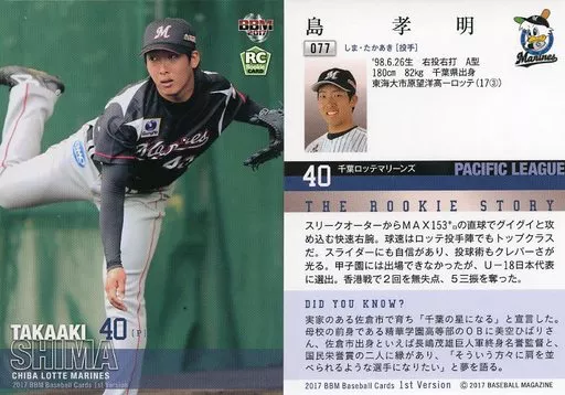 Japanese title: BBM/レギュラーカード/千葉ロッテマリーンズ/BBM2017 ベースボールカード 1stバージョン 077[レギュラーカード]:島孝明