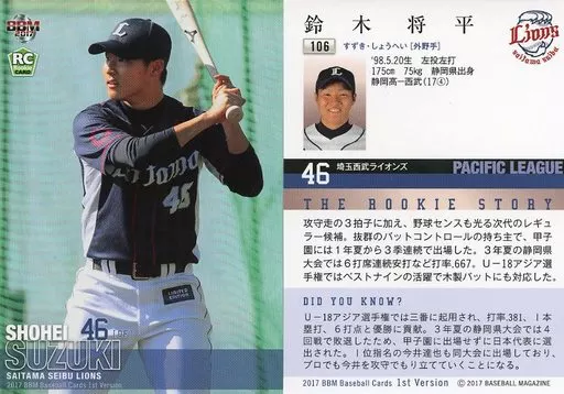 Japanese title: BBM/レギュラーカード/埼玉西武ライオンズ/BBM2017 ベースボールカード 1stバージョン 106[レギュラーカード]:鈴木将平
