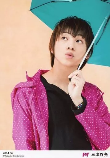 Japanese title: 生写真(男性)/俳優/D2 D2/三津谷亮/バストアップ・衣装ピンク・水玉模様・左手傘・口すぼめ・目線左上・背景ベージュ・「2014.06」/p.o.t会員限定ブロマイド