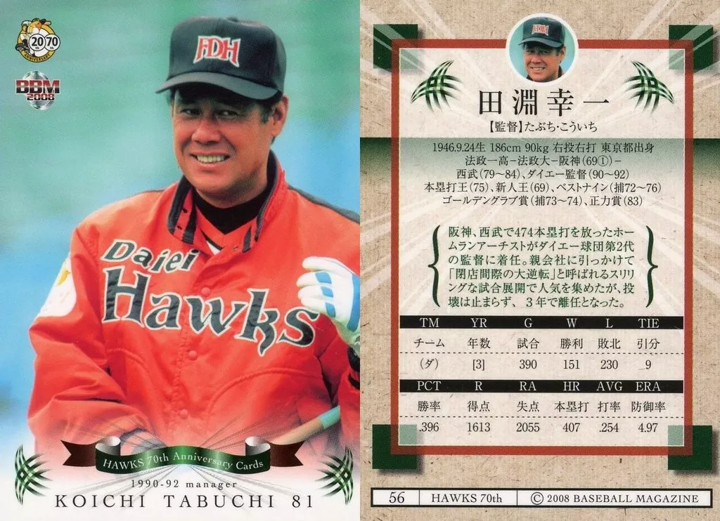 Japanese title: BBM/レギュラーカード/BBM2008 南海・ダイエー・ソフトバンクホークス70周年記念カード 56[レギュラーカード]:田淵幸一