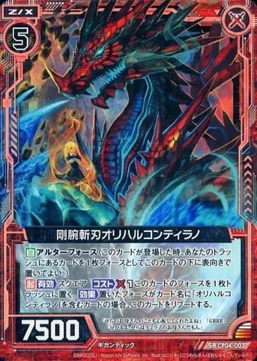 Japanese title: ゼクス/SR/ゼクス/赤/キャラクターパック オリハルコンティラノ CP04-003[SR]:剛腕斬刃オリハルコンティラノ