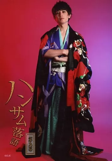 Official photo (male) / actor Soichiro Sorihashi / Whole Body / Costume Purple / Black / Haori / Armband / Background Pink / Stage :' Handsome Rakugo Act 9' Bromide B
