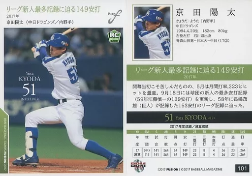 Japanese title: BBM/レギュラーカード/記録の殿堂/中日ドラゴンズ/BBM2017 FUSION 101[レギュラーカード]:京田陽太