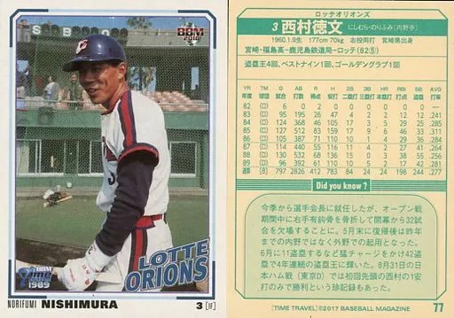 Japanese title: BBM/レギュラーカード/ロッテオリオンズ/BBM タイムトラベル1989 77[レギュラーカード]:西村徳文