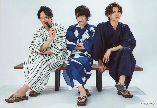 Japanese title: 生写真(男性)/俳優 集合(3人)/横型・全身・座り・浴衣・センター笹・土井右手扇子・口元・背景白/ツキプロ文化祭「死にかけ男が転生目指して芸能界で頑張ります!~しにてん~」イベント会場限定トレーディングブロマイド