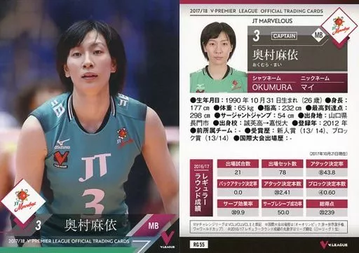 Japanese title: スポーツ/レギュラーカード/2017/18 V・プレミアリーグ女子公式トレーディングカード RG 55 [レギュラーカード] : 奥村麻依