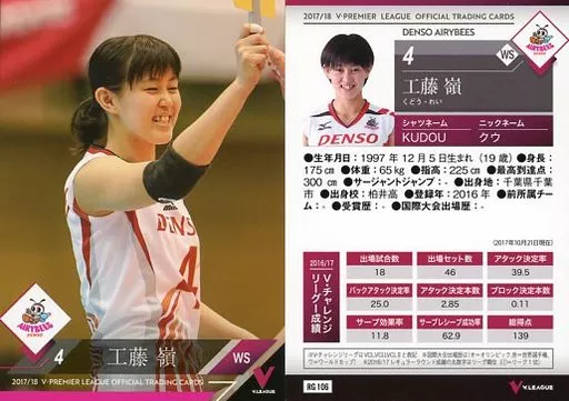 Japanese title: スポーツ/レギュラーカード/2017/18 V・プレミアリーグ女子公式トレーディングカード RG 106 [レギュラーカード] : 工藤嶺
