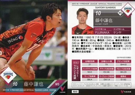 Japanese title: スポーツ/レギュラーカード/2017/18 V・プレミアリーグ男子公式トレーディングカード RG 63 [レギュラーカード] : 藤中謙也