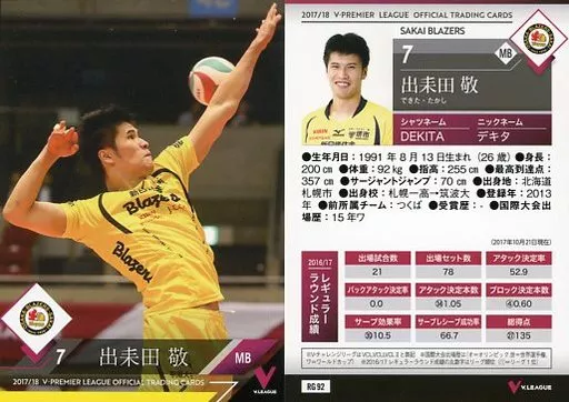 Japanese title: スポーツ/レギュラーカード/2017/18 V・プレミアリーグ男子公式トレーディングカード RG 92 [レギュラーカード] : 出耒田敬