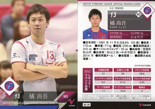 Japanese title: スポーツ/レギュラーカード/2017/18 V・プレミアリーグ男子公式トレーディングカード RG 129 [レギュラーカード] : 橘尚吾