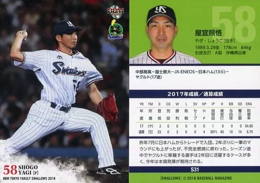 Japanese title: BBM/レギュラーカード/BBM2018 東京ヤクルトスワローズ S31[レギュラーカード]:屋宜照悟