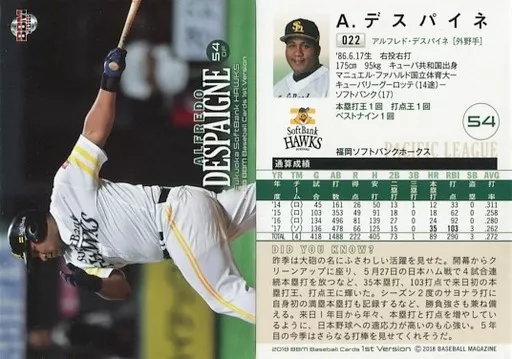 Japanese title: BBM/レギュラーカード/福岡ソフトバンクホークス/BBM2018 ベースボールカード 1stバージョン 022[レギュラーカード]:A.デスパイネ