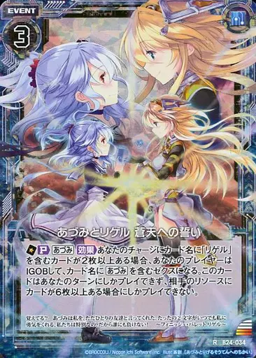 Japanese title: ゼクス/R/イベント/青/第24弾『誓約舞装編 絆が導く未来』 B24-034[R]:あづみとリゲル 蒼天への誓い(ホログラムレア)