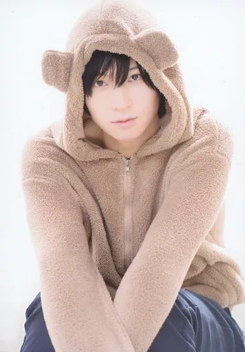 Japanese title: 生写真(男性)/俳優 荒牧慶彦/膝上・座り・衣装茶色・フード被り・両手下・背景白/「まきば会Vol.7、8バースデースペシャル」ブロマイド