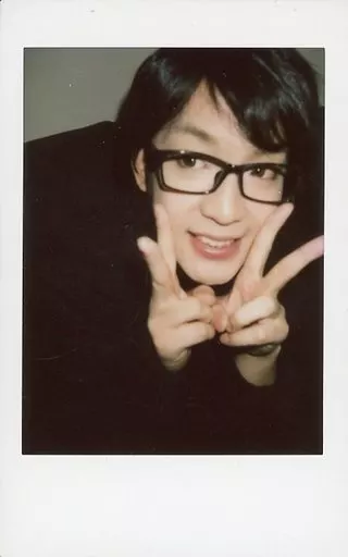 Japanese title: 生写真(男性)/ヴィジュアル系バンド/A&D A&D/KAGE/上半身・前屈み・衣装黒・眼鏡・両手ピース頬・目線左・体右向き・背景グレー/生チェキ